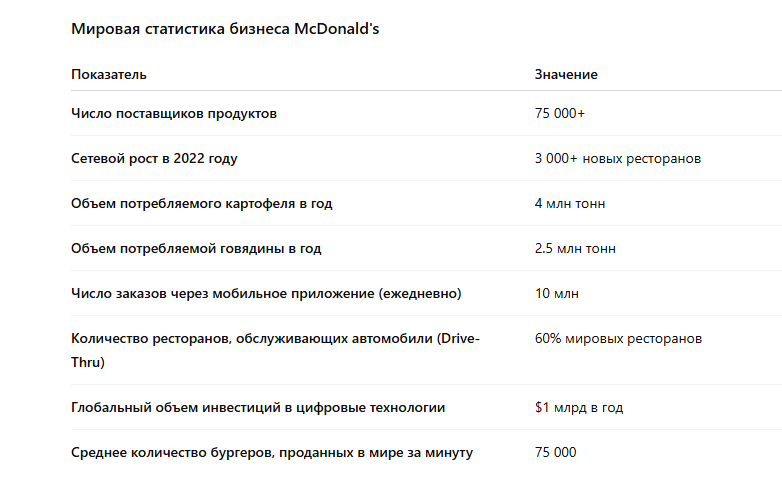 А рецепт успеха McDonald’s в бизнесе еще проще: тотальная стандартизация процессов, жесткий кастинг франчайзи, инновации в управлении недвижимостью и безумно эффективная реклама с маркетингом. Вот и вся формула, которая превратила обычный бургер в глобальный культ.