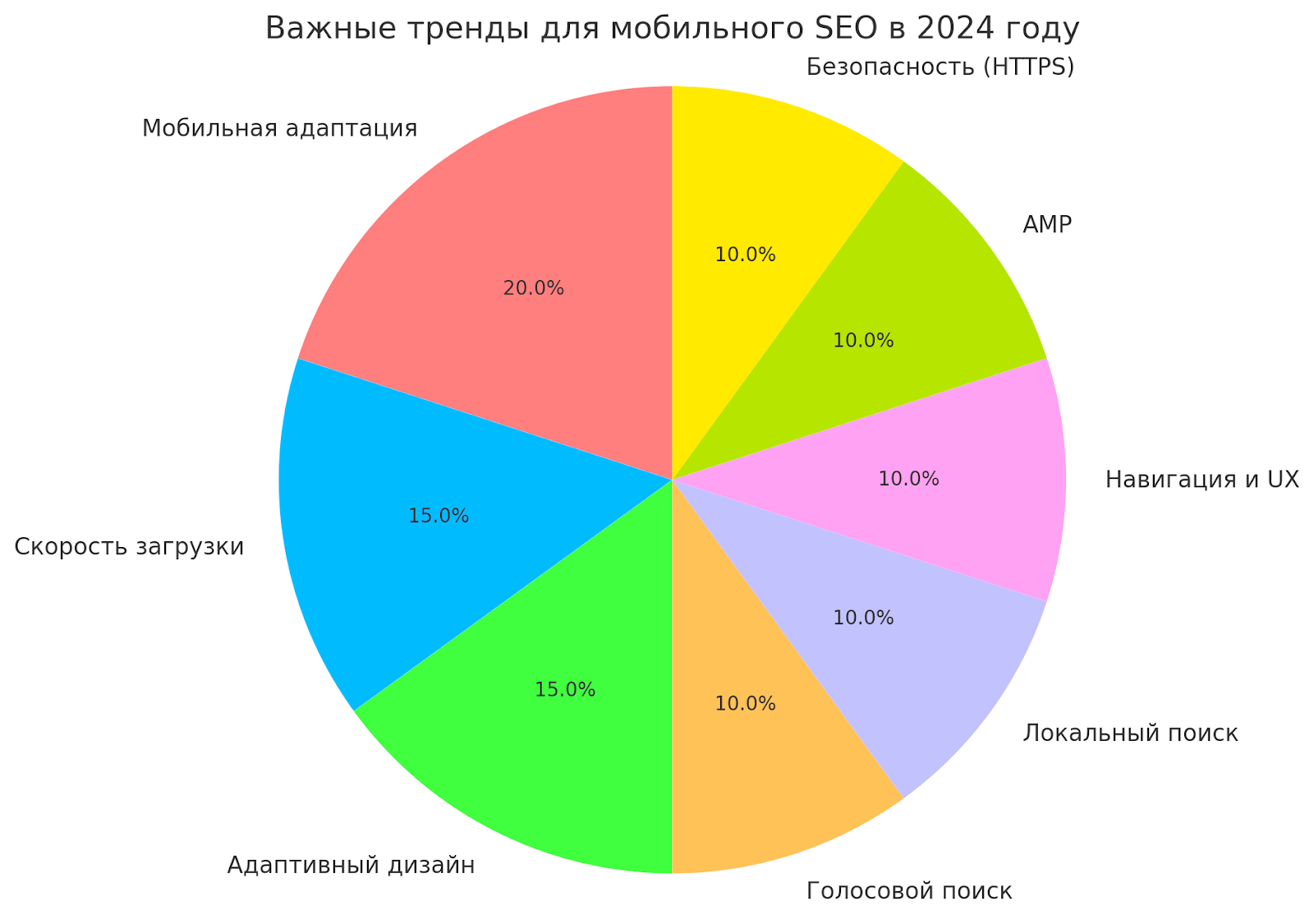 Вот диаграмма, демонстрирующая ключевые тренды мобильного SEO в 2024 году. Она отражает вклад различных аспектов, таких как адаптивный дизайн, голосовой поиск, локальный поиск, улучшение пользовательского опыта (UX/UI), AMP и безопасность (HTTPS).