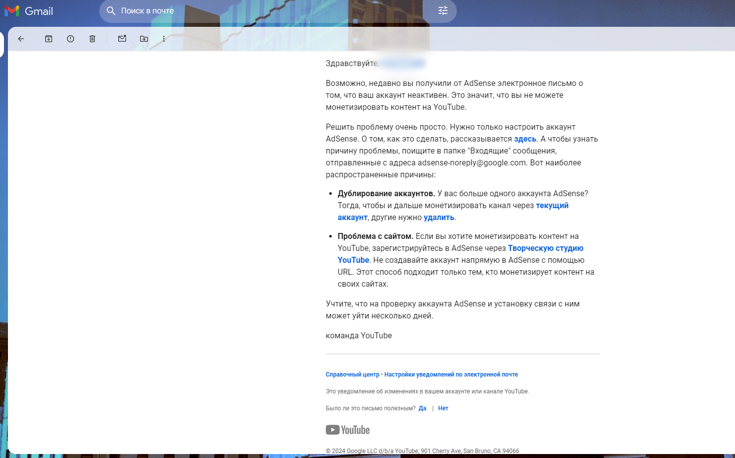 Россияне удивляются письмам от AdSense о монетизации давно ограниченных YouTube-каналов.