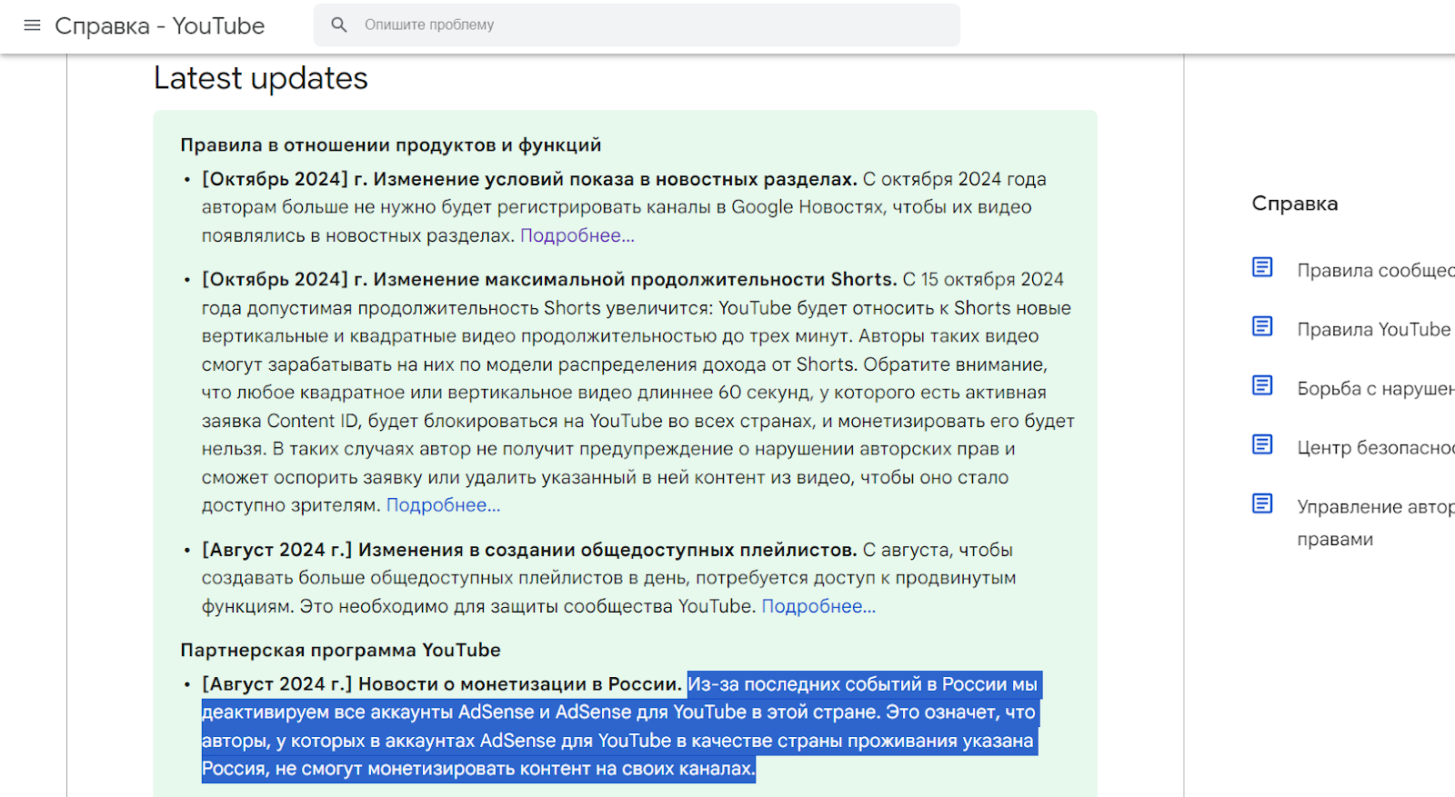 В октябре 2024 года российские владельцы YouTube-каналов стали получать письма от AdSense с предложением решить проблему с отключенной монетизацией. Письма сбивают с толку пользователей, которые уже привыкли к ограничениям, действующим в связи с событиями на Украине. На фоне специальной военной операции YouTube заявил о полной деактивации аккаунтов AdSense на территории России.